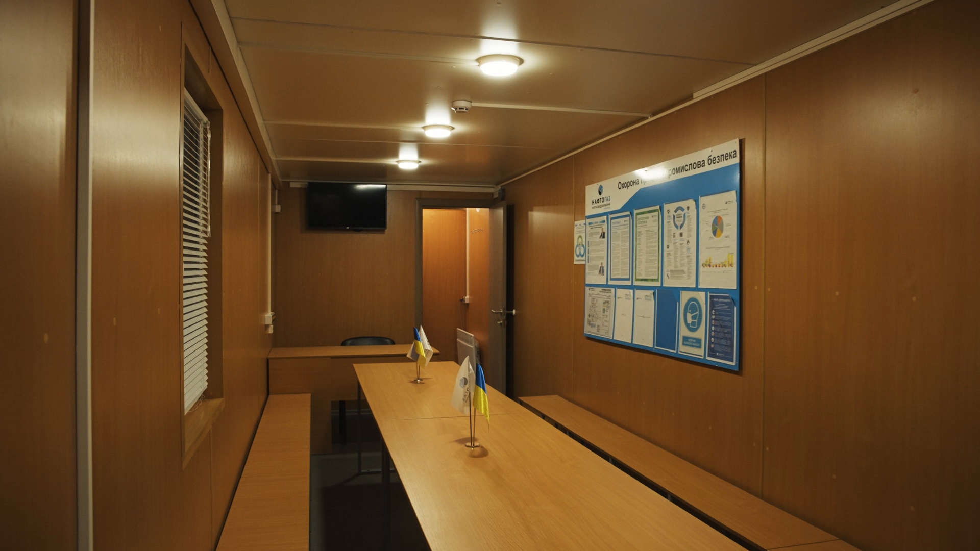 Вагон укомплектований столом для переговорів, необхідними меблями, орг. технікою. Встановлена система опалення і кондиціювання,ситсема протипожежної безпеки з відповідними сповіщувачами (димові, теплові).