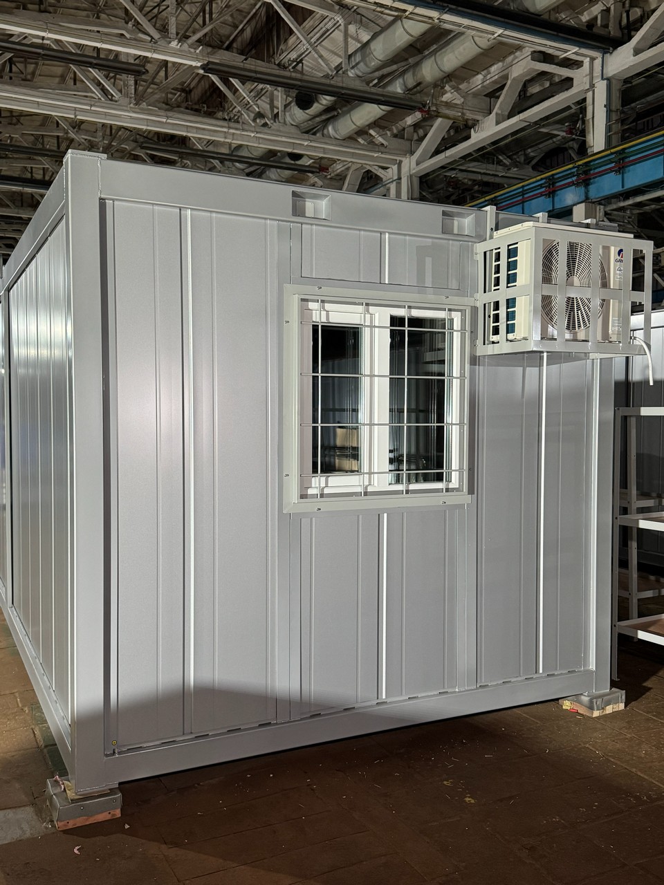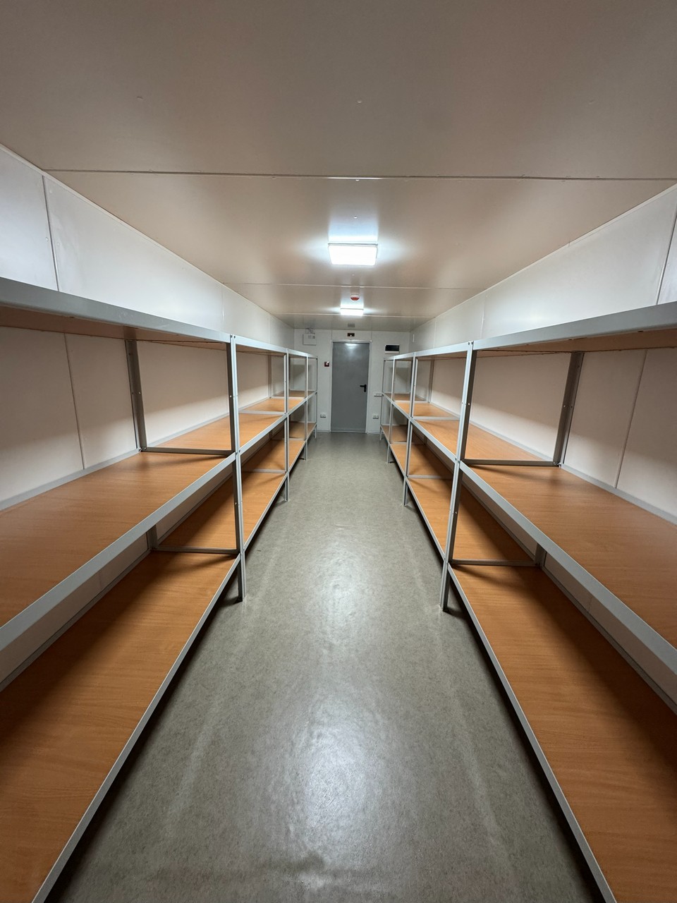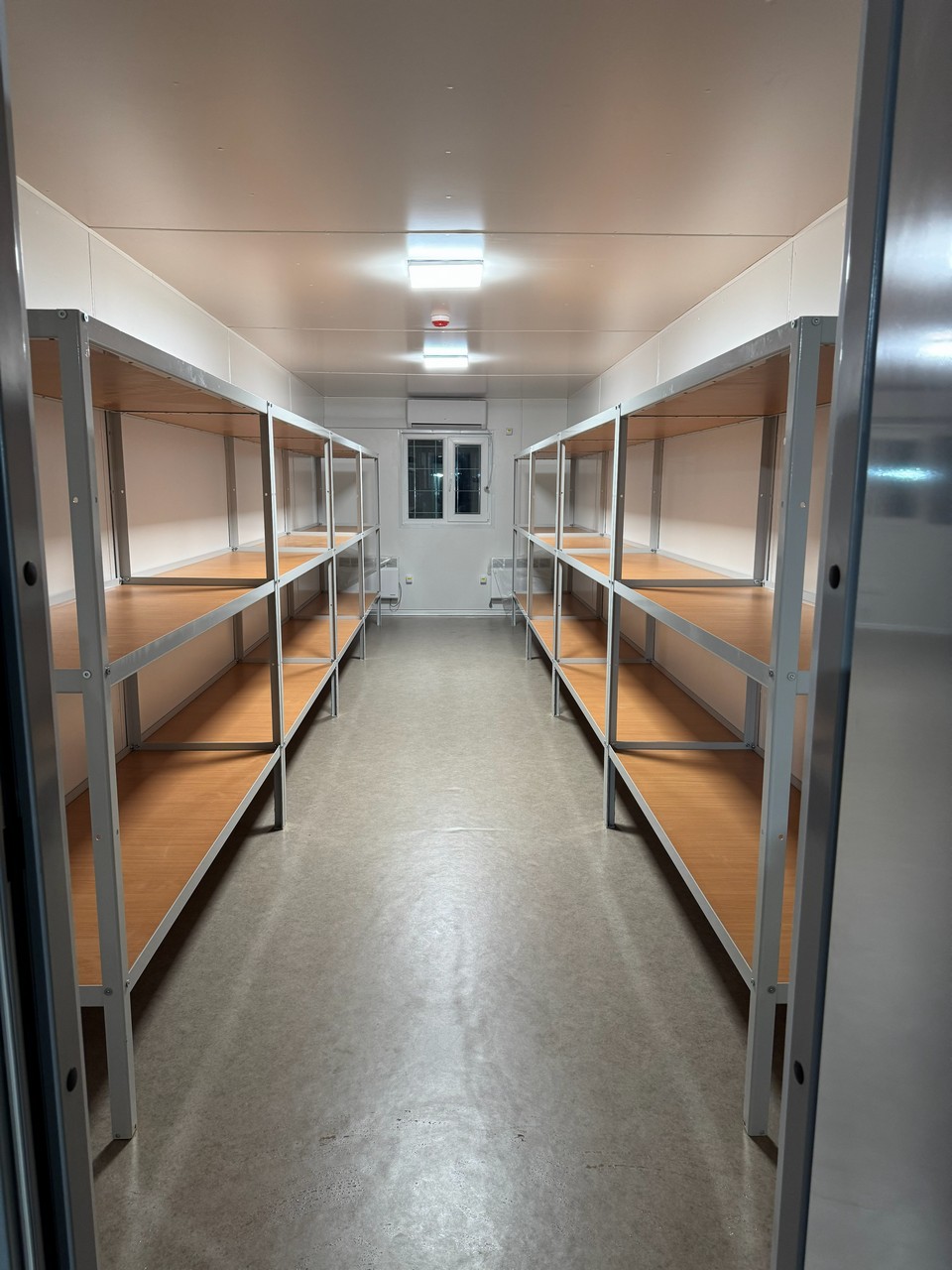Дах підготовлений для монтажу ПВХ мембрани, а в колонах інтегровано систему відведення дощової води через труби Ø100 мм. Усередині передбачена прихована електромережа, протипожежна сигналізація та встановлений кондиціонер, підібраний під площу приміщення. Модуль комплектується розбірними металевими стелажами, що дозволяє організувати зберігання максимально ефективно.