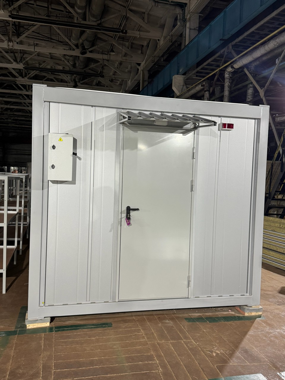 Модульний склад площею 26 м² розроблений як компактне, але містке складське приміщення з можливістю вертикального розширення. Основний конструктив — цільнозварний модуль із сендвіч-панелей, утеплених мінеральною ватою, що забезпечує вогнестійкість і стабільну температуру всередині.